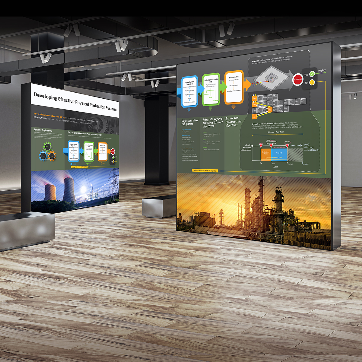 The Technology Training and Demonstration Area is a museum-style center used to demonstrate technologies, concepts, and approaches to meet global security challenges. Visitors can view stations for information and hands-on examples. This set of 5 panels, displayed together, focuses on physical protection systems.