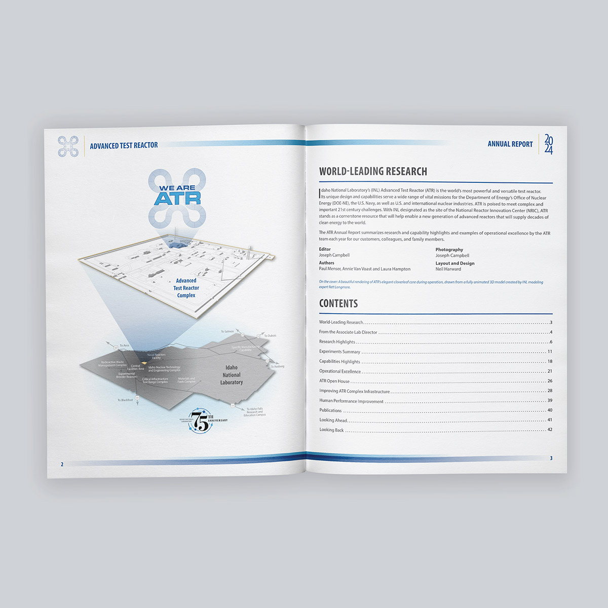 The Idaho National Laboratory’s Advanced Test Reactor (ATR) is the world’s premier nuclear test reactor. This yearly report highlights research, capabilities, and the operational excellence of ATR. A focal point of this publication is the long-term asset management for improving ATR’s complex infrastructure and human performance.