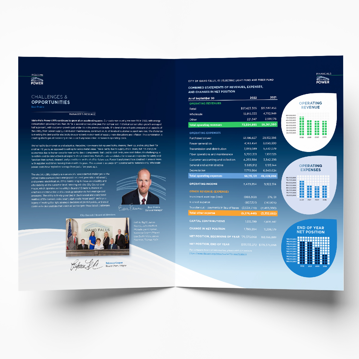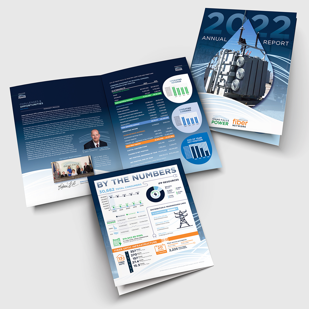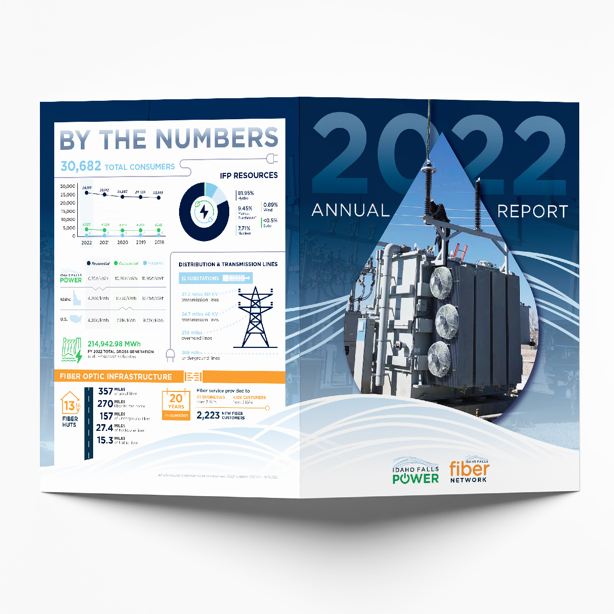 This innovative Annual Report for the City of Idaho Falls Power won acclaim from the Academy of Interactive and Visual Arts for its creative data presentation. It even earned a place on their Annual Report of Annual Reports, which showcases elements of award-winning corporate communications. Packed with data about hydropower, the bold infographics and animated visuals ensure this publication is anything but dry.