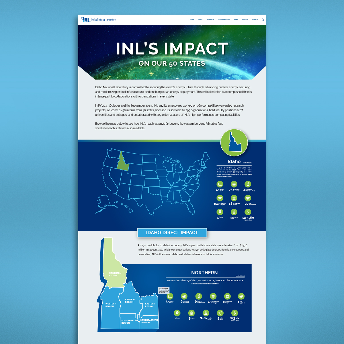 RED Inc. was tasked to create an infographic-style website to display the Idaho National Laboratory’s impact across states nationwide. This site organizes large amounts of information in a graphically pleasing way, while aligning with the lab’s brand standards.