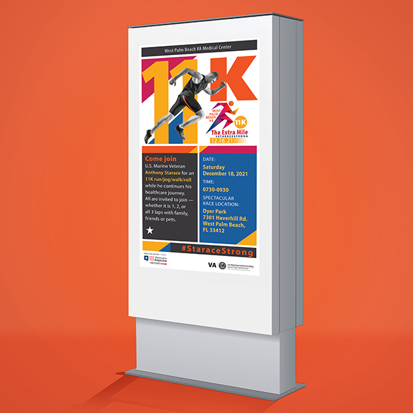 Event promotions included a social media graphic, e-board, flyer, t-shirt graphic, and signage. All were used to promote a walk/run event held in December 2021 in West Palm Beach, Florida.