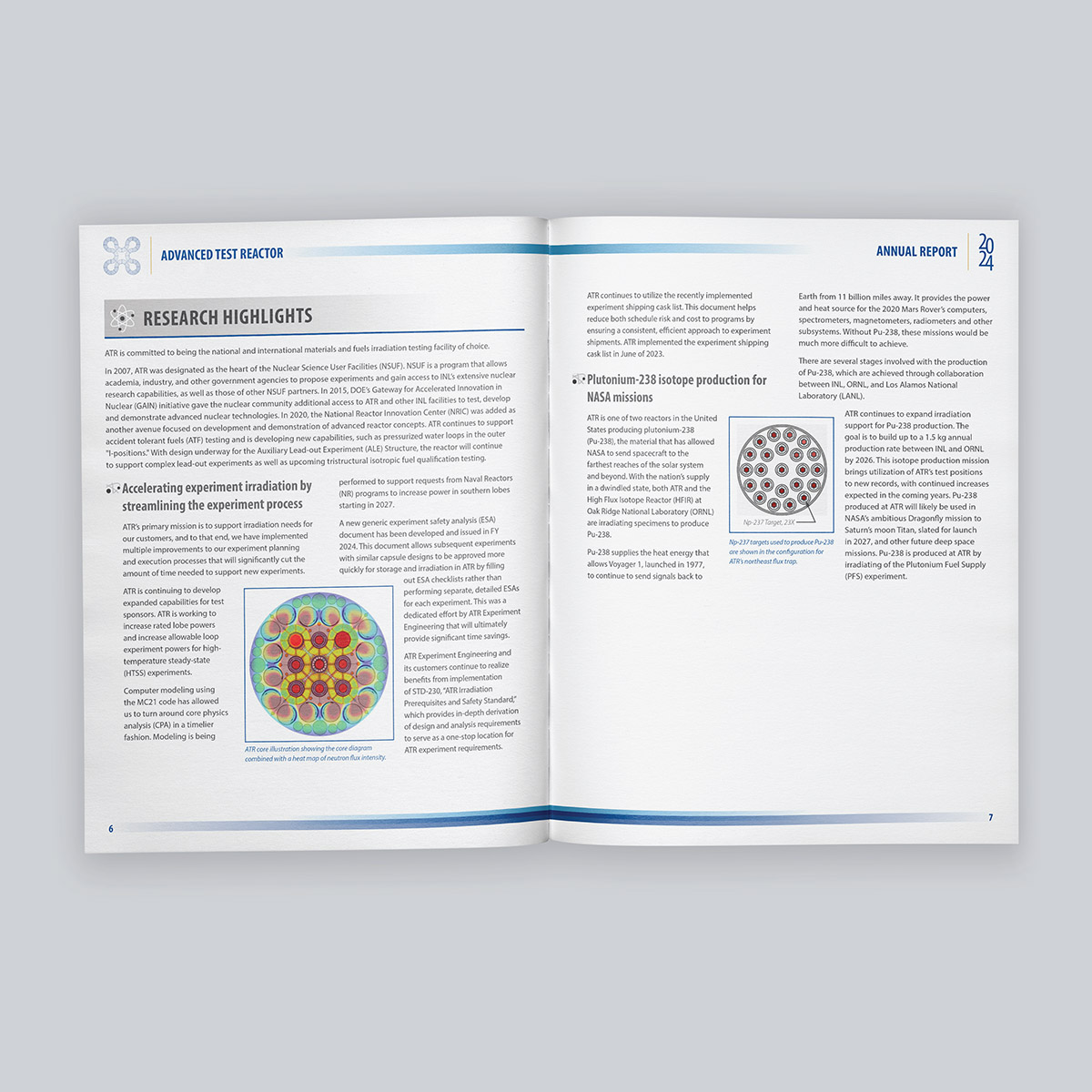 The Idaho National Laboratory’s Advanced Test Reactor (ATR) is the world’s premier nuclear test reactor. This yearly report highlights research, capabilities, and the operational excellence of ATR. A focal point of this publication is the long-term asset management for improving ATR’s complex infrastructure and human performance.
